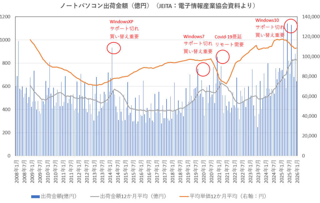2026年1月のパソコン販売状況は、出荷台数は489千台と出荷金額は643億円となっております。